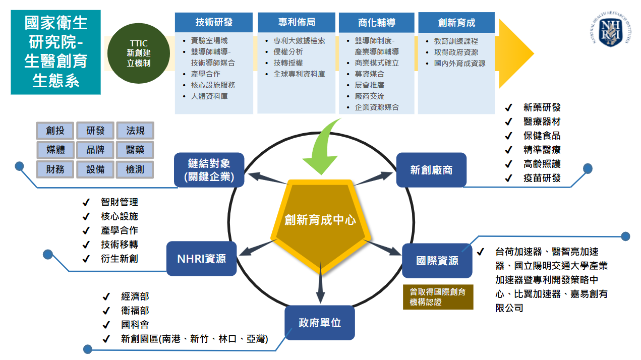 國家衛生研究院創新育成中心(以下簡稱本中心)致力於建立一個提供企業孕育新技術、新產品的專業場所,旨在降低技術商品化過程中的成本與風險,並提高事業成功的機會。