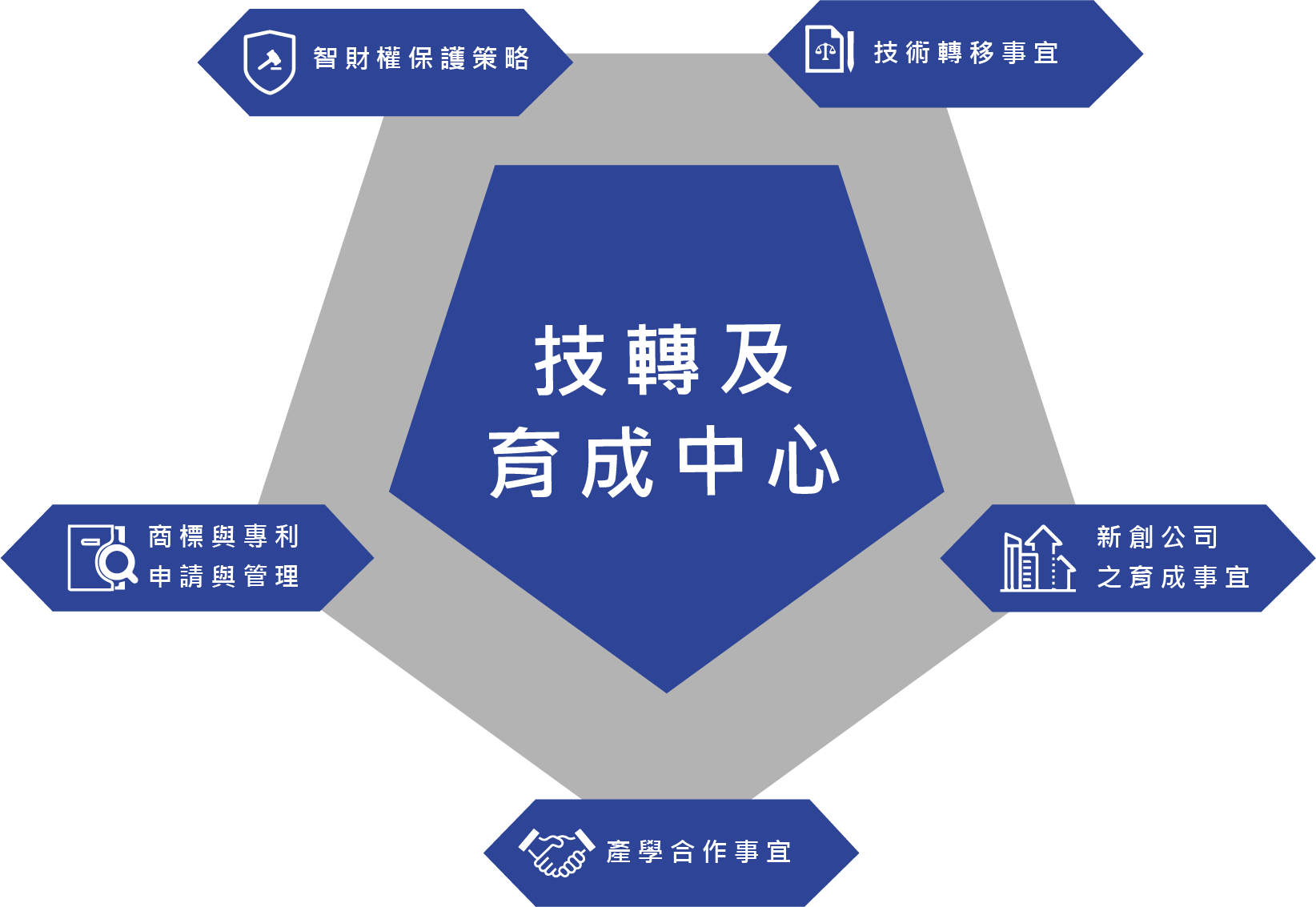 組織架構 關於TTIC 國家衛生研究院技轉及育成中心對內提供智慧財產管理及評估等服務,對外積極與學研單位及產業界合作,並設有新創育成中心提供新創產業發展的資源及空間,為連結產學研的多元橋樑協助本院引領我國生技醫藥科技研發成果商化加值與新創產業培育的任務。 中心業務 智財技轉組 技術分析與市場評估、專利加值評估、辦理事務所專利申請程序、專利與技術授權移轉及推廣 本院研發成果盤點、分析與管理 研發成果專利申請程序及維護 研發成果商品化諮詢與推廣 智慧財產權諮詢 產研企劃組 產學研合作窗口、媒合/推廣/服務 協助本院研發成果推廣 建制產研合作資訊平台 協助標竿企業在本院設置聯合研發中心 政府產學合作計畫 創新育成中心 新創團隊培育與輔導 提供育成廠商育成空間 以「平台式」輔導為原則,提供技術支援、渠道連結、創投資金支援、商務諮詢等 提供豐沛資訊網路、政府政策及產業資訊支援 經濟部育成計畫 行政支援 行政流程處理及服務 中心行政流程處理及服務 中心經費申請與核銷 文件傳遞管理 服務項目 主任 翁國曜 allan_weng@nhri.edu.tw 督導並協調技轉及育成中心各項業務之推動 產研企劃組 梁華軒 代理科長(兼組長) 分機33206huahsuan@nhri.edu.tw 綜合業務: 協助行政業務 業務推廣 外部計畫爭取 其他交辦業務 產學合作業務: 生醫工程及奈米研究所 國家環境醫學研究所 神經及精神醫學研究中心 分子與基因醫學研究所 謝琬萍 分機33227wanping@nhri.edu.tw 產學合作業務:生技與藥物研究所癌症研究所免疫醫學研究中心國家蚊媒傳染病防治研究中心材料移轉合約(MTA)審閱:生技與藥物研究所、癌症研究所、免疫醫學研究中心、國家蚊媒傳染病防治研究中心、群體健康科學研究所、細胞及系統醫學研究所、生醫工程及奈米醫學研究所、國家環境醫學研究所、神經及精神醫學研究中心、高齡醫學暨健康福祉研究中心 劉軍呈 分機33203jcliu@nhri.edu.tw 產學合作業務: 感染症與疫苗研究所生物製劑廠 群體健康科學研究所 細胞與系統醫學研究所 材料移轉合約(MTA)審閱: 感染症與疫苗研究所(含NIDB)、分子與基因醫學研究所(含斑馬魚核心設施) 智財技轉組 謝汶娟(組⻑) 分機33209 wenchuan@nhri.edu.tw 智財技轉業務: ⽣技與藥物研究所 神經及精神醫學研究中⼼ 國家環境醫學研究所 癌症研究所 吳萃慧 分機33202 tsuiwu@nhri.edu.tw 智財技轉業務: 免疫醫學研究中⼼ 感染症與疫苗研究所 分⼦與基因醫學研究所 曾安立 分機33211 anlitseng@nhri.edu.tw 智財技轉業務: 群體健康研究所 細胞及系統研究所 ⾼齡醫學暨健康福祉研究中⼼ ⽣醫⼯程及奈米研究所 創新育成中⼼ 葉忠祐 (組⻑) 分機33212 richardyeh@nhri.edu.tw 育成與⽣物科技管理 協助推動衍⽣與新創公司 募資 股票處置 杜雅菱 分機35125 dyl0616@nhri.edu.tw 協助執⾏經濟部中⼩企業處中⼩企業創育機構發展計畫活動 創新育成相關業務推動 協助招商計畫及廠商拜訪 計畫經費控管 ⾏政⽀援 趙天麗 分機33201tammychao@nhri.edu.tw 中心行政事宜
