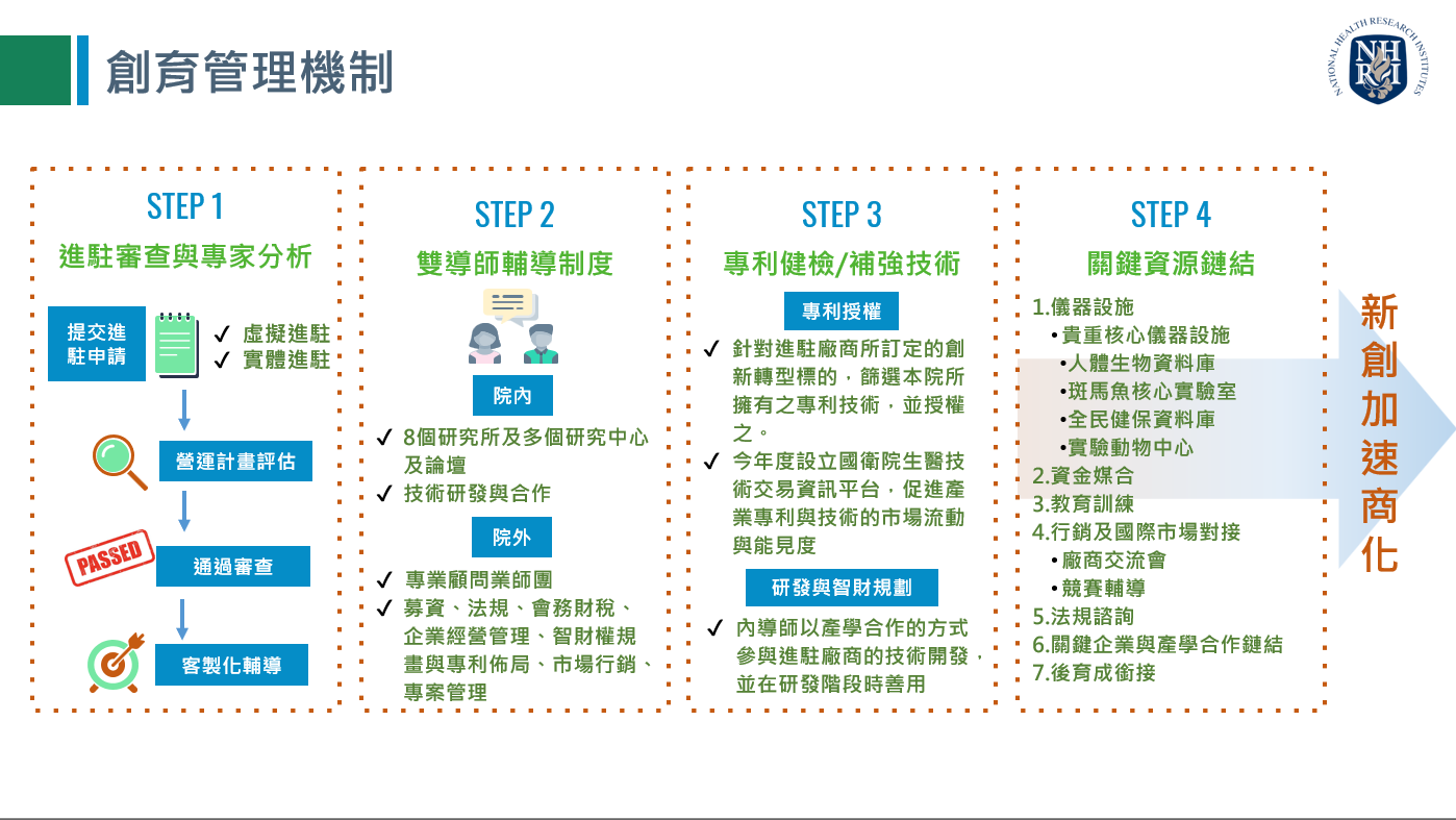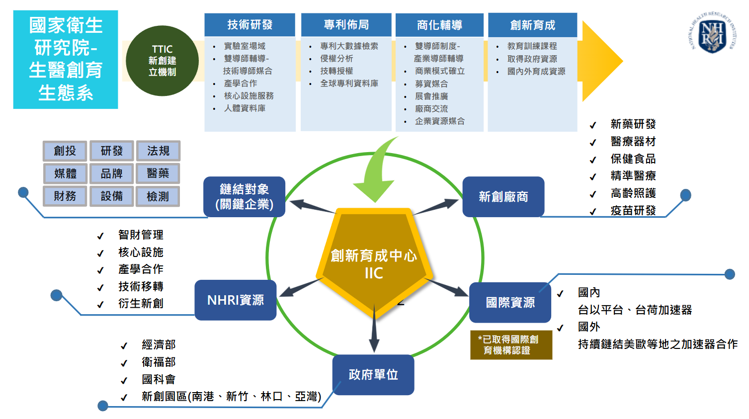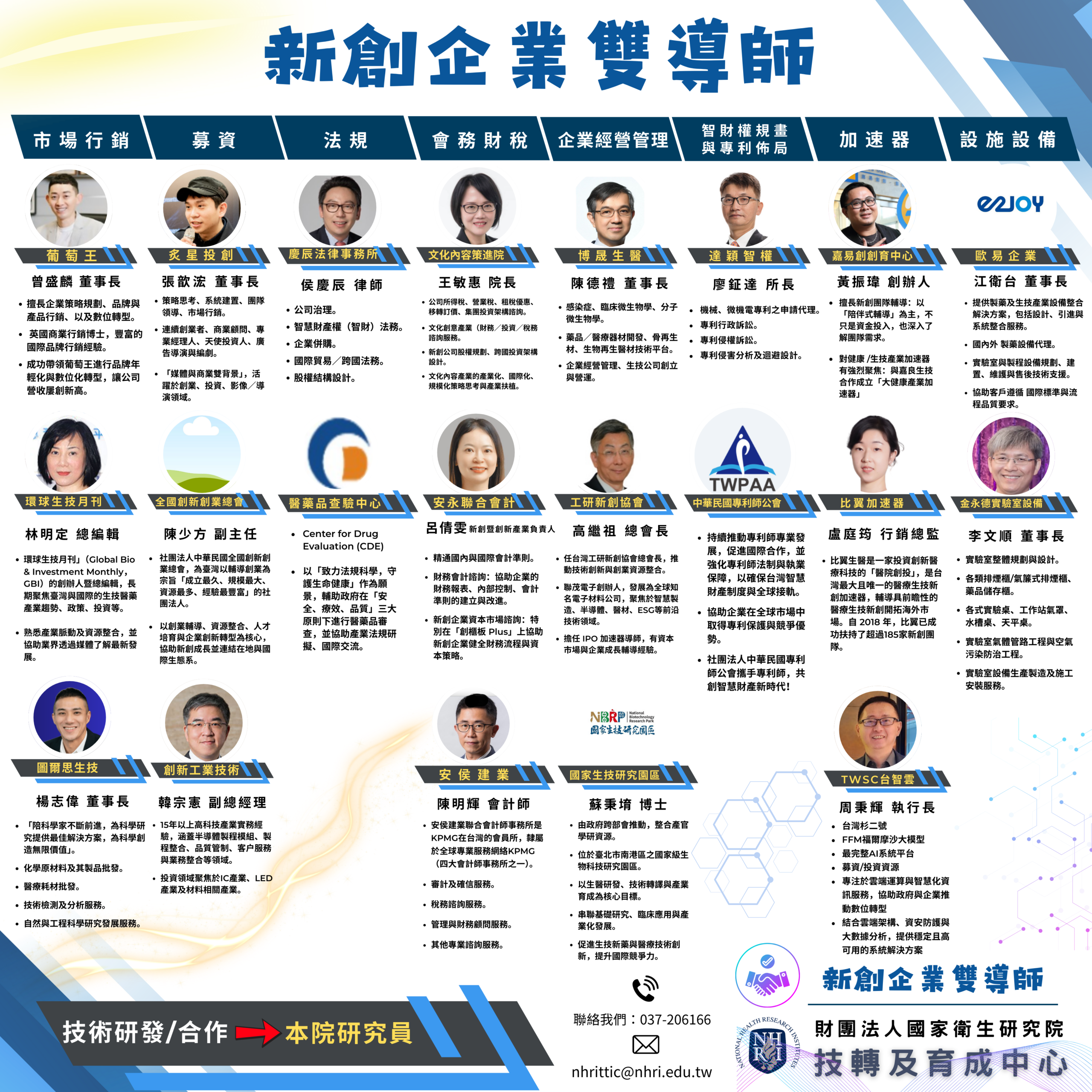 輔導與資源 技術導師 生技與藥物研究所 謝興邦 職稱 : 研究員 產業領域 : 新藥研發 專長領域 小分子藥物研發 藥物設計與合成 化學生物 天然物合成 蔣維堂 職稱 : 研究員 產業領域 : 新藥研發 專長領域小分子藥物研發 鄒倫 職稱 : 副研究員 產業領域 : 新藥研發 專長領域 生物共軛化學 化學生物學 轉譯後修飾 抗病毒藥和抗病毒藥 蛋白質交互作用抑製劑 細胞及系統醫學研究所 郭呈欽 職稱 : 副研究員 產業領域 : 新藥研發 專長領域 小分子藥物研發 分子細胞免疫 訊息傳導 訊息傳導 酵素動力學 顏伶汝 職稱 : 研究員 產業領域 : 精準醫療 專長領域 幹細胞研究 婦女醫學 李華容 職稱 : 副所長 產業領域 : 精準醫療 專長領域 神經再生 幹細胞衍生物 心肌梗塞 癌症研究所(上呼吸消化道癌) 劉柯俊 職稱 : 研究員 產業領域 : 新藥研發 專長領域 大分子藥物研發 腫瘤生物學 免疫學 癌症免疫治療 感染症與疫苗研究所 陳信偉 職稱 : 研究員 產業領域 : 疫苗研發 專長領域 疫苗開發 微生物免疫學 生物化學與分子生物學 生物化學與分子生物學 病毒學 劉士任 職稱 : 研究員 產業領域 : 疫苗研發 專長領域 疫苗開發 周彥宏 職稱 : 研究員 產業領域 : 疫苗研發 專長領域 疫苗開發 分子病毒學 腫瘤生物學 信號傳導 國家衛生研究院 生醫工程與奈米醫學研究所(生醫工程領域) 林峯輝 職稱 : 特聘研究員 產業領域 : 醫療器材 專長領域 再生醫學 生物材料 組織工程 許佳賢 職稱 : 研究員 產業領域 : 醫療器材 專長領域 生醫微流體技術 組織工程 及時診斷 再生醫學 國家衛生研究院 生醫工程與奈米醫學研究所(奈米醫學領域) 楊重熙 職稱 : 特聘研究員 產業領域 : 醫療器材 專長領域 奈米醫學 羅履維 職稱 : 研究員 產業領域 : 醫療器材 專長領域 奈米醫學 生物光子學 分子影像學 林淑宜 職稱 : 研究員 產業領域 : 醫療器材 專長領域 分析化學 表面化徐 藥物/siRNA 聚合物載體 奈米點 國家衛生研究院 生醫工程與奈米醫學研究所(生醫電子領域) 陳景欣 職稱 : 副研究員 產業領域 : 醫療器材 專長領域 生物醫學 高能量聚焦式超音波 high-intensityfocused ultrasound (HIFU) 神經及精神醫學研究中心 陳慧諴 職稱 : 研究員 產業領域 : 保健食品 專長領域 藥物及保健食品開發 毒理學 藥理 謝奉勳 職稱 : 副研究員 產業領域 : 保健食品 專長領域 藥物及保健食品開發 神經退化疾病與治療藥物開發 酯類代謝 小分子生物製劑 合作導師 進駐企業 台宇生醫股份有限公司 查看網站 Novotech Nutraceuticals, Inc. 查看網站 台灣元創醫療器材有限公司 查看網站 安鑫生物科技股份有限公司 查看網站 艾博爾股份有限公司 查看網站 成發生技股份有限公司 查看網站 拜爾國際股份有限公司 查看網站 麗旺生技有限公司 查看網站 碁米庫斯生物科技股份有限公司 查看網站 伯森生物科技股份有限公司 查看網站 歐易企業股份有限公司 查看網站 活動海報