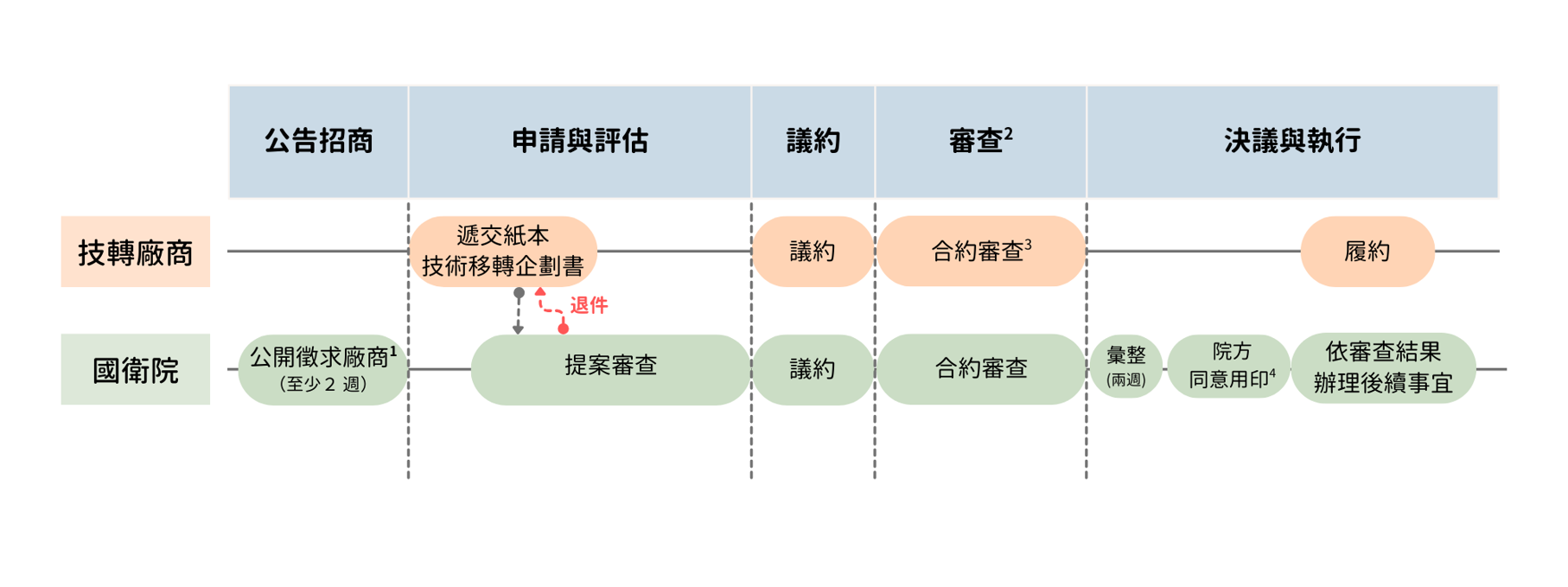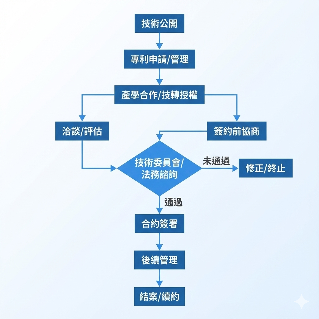 技術移轉 申請流程 公告方式:本院技術推廣依各計畫來源(資助機關)之規範辦理;最新招商資訊與公告細節,請逕洽本中心審查程序:非專屬授權得採書面審查,廠商無需出席;若涉及專屬授權、境外實施、再授權或讓與等情事,將採會議審查,審查當日需請廠商指派專人出席進行說明。審查時程:書面審查為;會議審查原則為每月召開乙次。(具體會議日期請洽個案承辦人確認)。行政核准:授權對象或區域涉及大陸地區、港澳,或涉及再授權、讓與等態樣,依規須報請主管機關核准。因部會審查流程通常需時 3 至 6 個月,請廠商務必預留行政作業時間,俟接獲核准函後始得辦理簽約用印。 國家衛生研究院技術移轉企劃書 下載